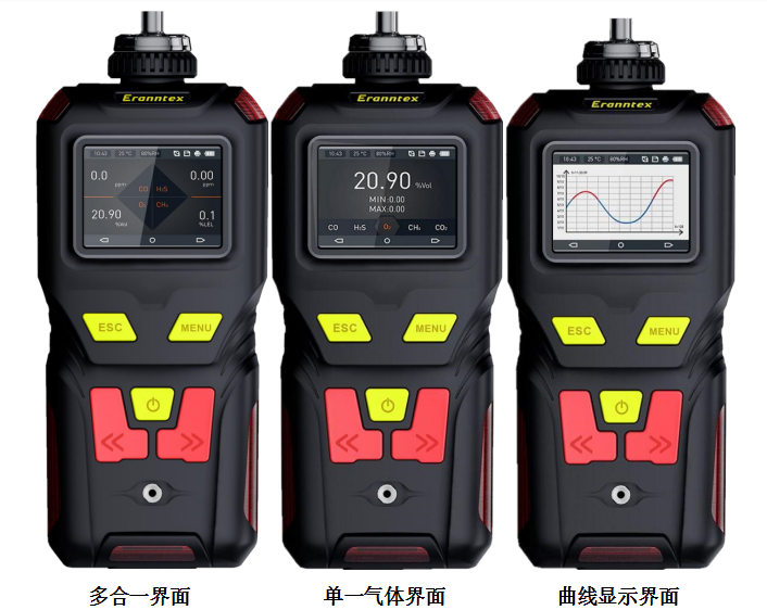●三種顯示模式可切換:同時顯示四種氣體濃度、大字體循環(huán)顯示單通道氣體的濃度、實時曲線,各通道之間自動循環(huán)或手動循環(huán)可切換,可設置是否顯示最大值、最小值、氣體名稱,可查看歷史記錄曲線圖。