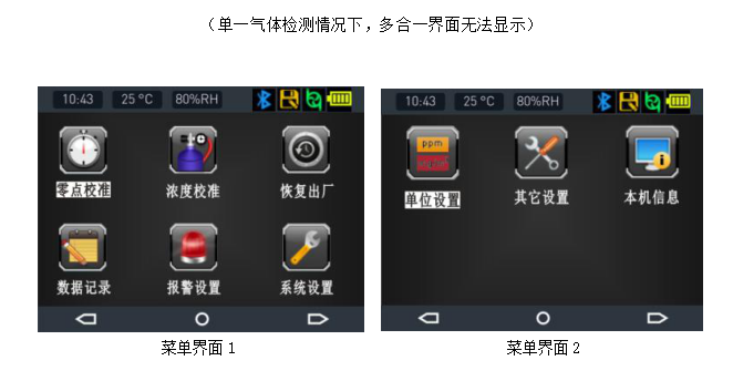 ●2.31英寸高清彩屏顯示實時濃度、報警、時間、溫度、濕度、存儲、通信、電量、充電狀態(tài)等信息,菜單界面采用高清仿真圖標顯示各個菜單的功能名稱